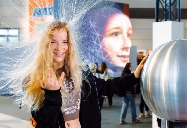 ▲ Hochspannend: Einer Schülerin stehen bei diesem Elektronik-Experiment am Stand von NiedersachsenMetall buchstäblich die Haare zu Berge.