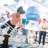 ▲Von Technik und dem Fliegen begeistert: Insa Thiele-Eich, die erste deutsche Astronauten-Anwärterin, testet den Flugsimulator von Airbus.