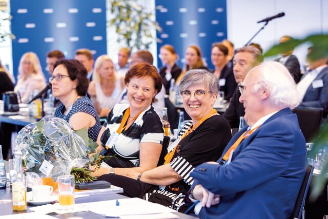 ▲ Mit großem Dank: Die Mitgliederversammlung verabschiedet Andrea Henning (2.v.r.) und Robert Stafflage (rechts) aus ihren Ämtern als Vizepräsidentin und Vorsitzender des Verwaltungsausschusses.